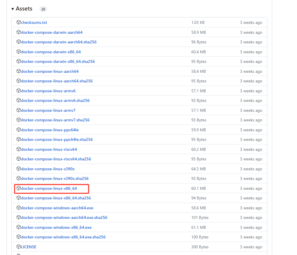 https://github.com/docker/compose/releases 地址下下载docker-compose资源,根据合适的操作系统和cpu架构选择合适的版本