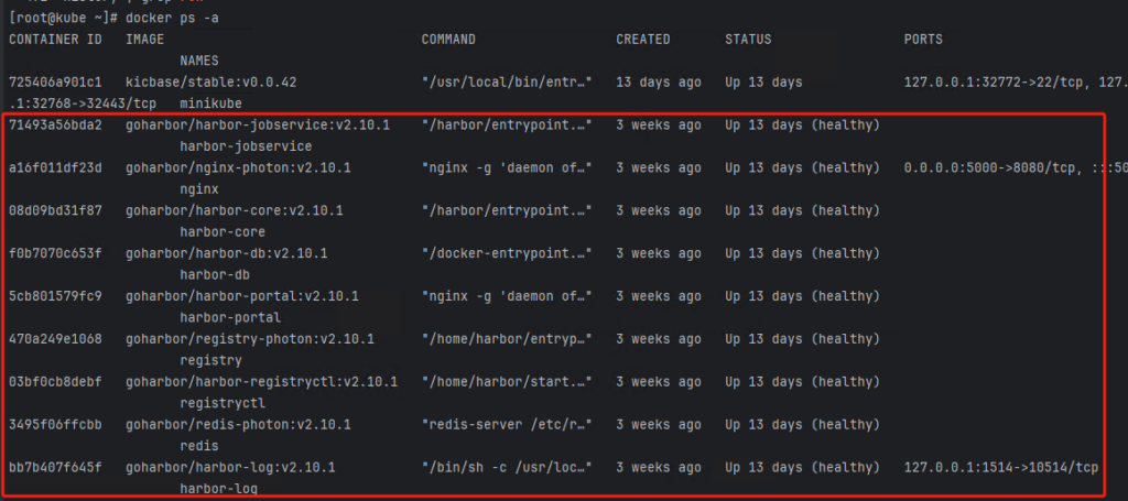 安装完成,harbor启动后,docker中会出现如下相关容器