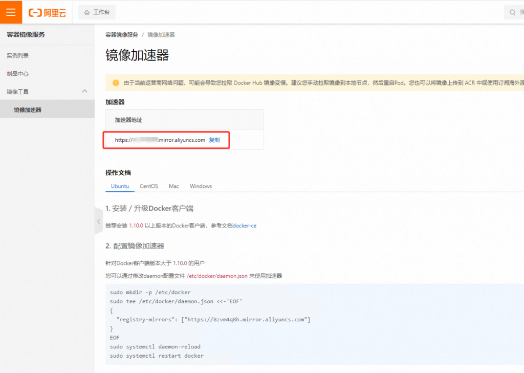 阿里云->容器镜像服务->镜像工具->镜像加速器
