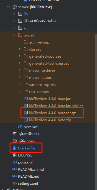 对源码 maven package后将server/target下的 kkFileView-4.4.0-beta.tar.gz 文件和根目录的Dockerfile(注意这里的Dockerfile和之前步骤的Dockerfile不是同一个,作用也不一样)上传至服务器