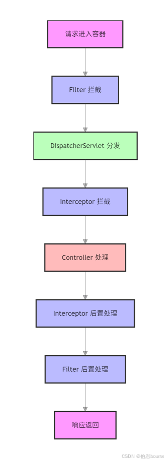 请求进入容器 → Filter 拦截 → DispatcherServlet 分发 → Interceptor 拦截 → Controller 处理 → Interceptor 后置处理 → Filter 后置处理 → 响应返回