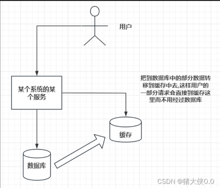 直接操作缓存能够承受的请求是远远大于直接访问数据库的,所以我们可以考虑 把数据库中的部分数据转移到缓存中去,这样用户的一部分请求会直接到缓存这 里而不用经过数据库。