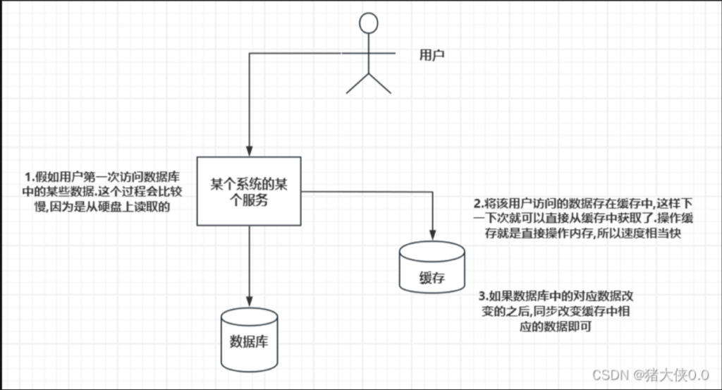 假如用户第一次访问数据库中的某些数据。这个过程会比较慢,因为是从硬盘上 读取的。将该用户访问的数据存在数缓存中,这样下一次再访问这些数据的时候 就可以直接从缓存中获取了。操作缓存就是直接操作内存,所以速度相当快。如 果数据库中的对应数据改变的之后,同步改变缓存中相应的数据即可!