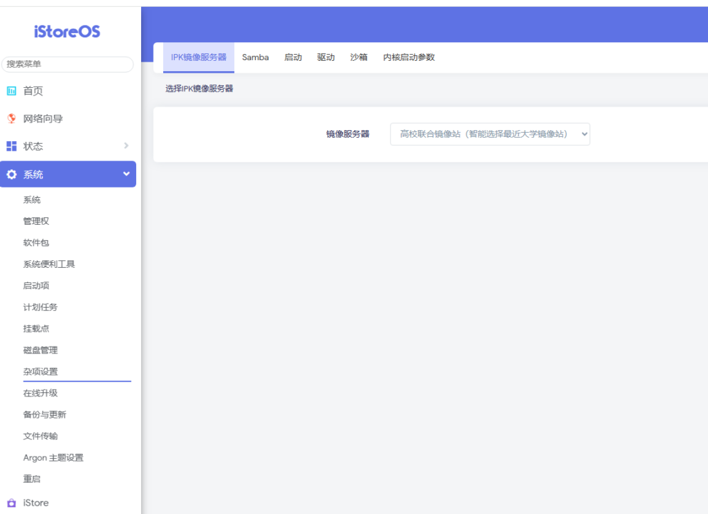 在系统->杂项设置 中,将镜像服务器选择如下图所示。(如果不选,则影响opkg update执行)