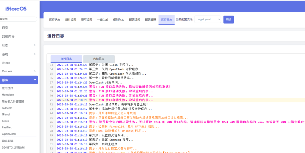 iStoreOS的openclash,运行模式选择“TUN”或者“混合”时,提示:警告:TUN 接口启动失败,尝试重启内核…,导致openclash一直重启,内网以旁路由为网关的虚拟机和服务,访问互联网和外网都出现了无法打开的情况。