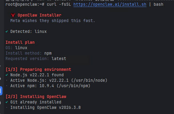 OpenClaw 的核心依赖是 Node.js,必须安装 22.x 或更高版本。通过官方源安装是最稳定的方法。