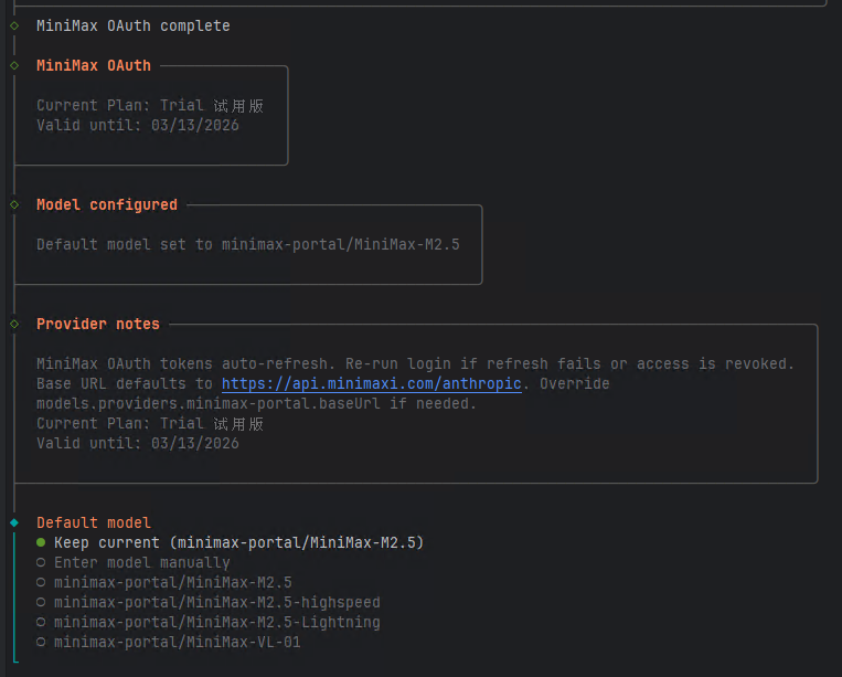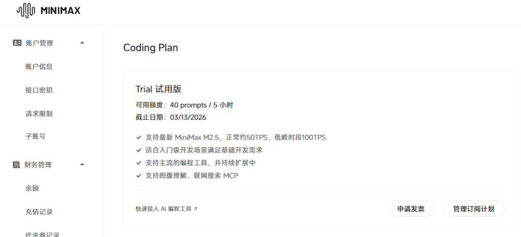 申请大模型api:根据自己的喜好选择。(博主使用的是minimax2.5 模型试用)