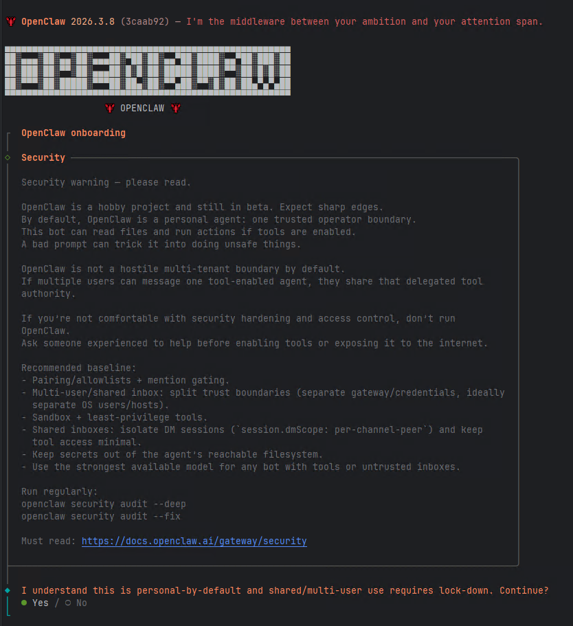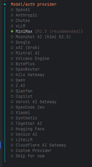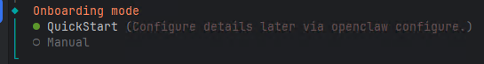 安装完成后命令行自动进入配置安装,后续也可以使用 openclaw onboard 命令进行配置