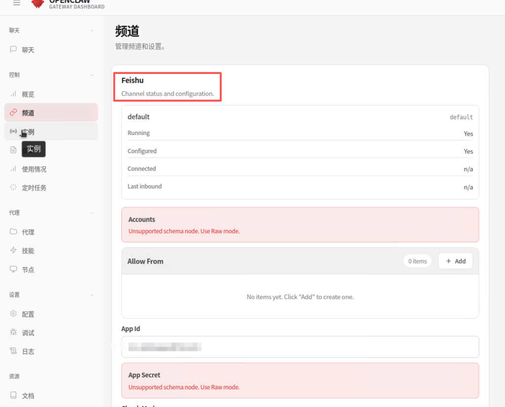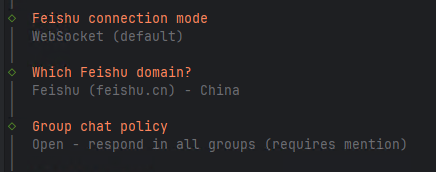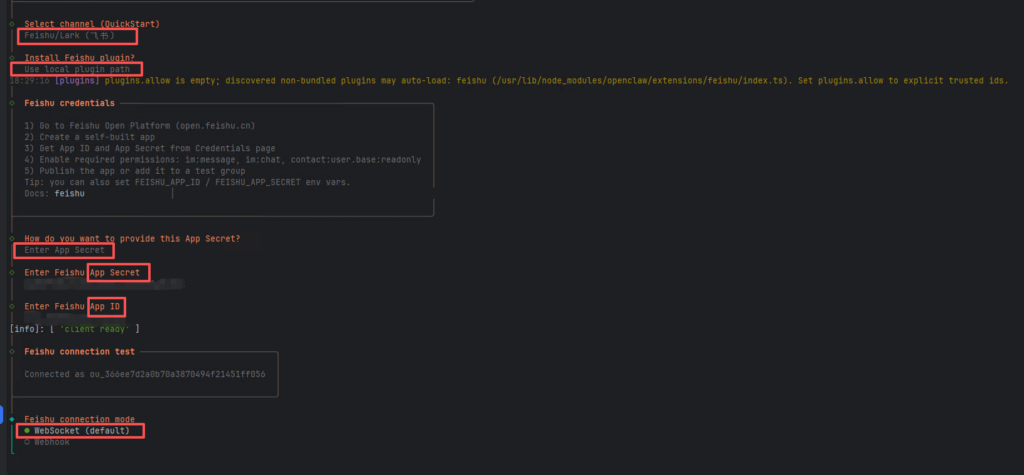 此处注意和飞书中的先后次序(可以参考:https://blog.lhyshome.com/2026/03/11/416/),要是配置错误页没关系,可以重复执行openclaw onboard 命令进行配置