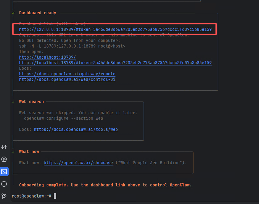 在安装了OpenClaw的服务器上打开红框中的地址即可访问OpenClaw的webUI页面