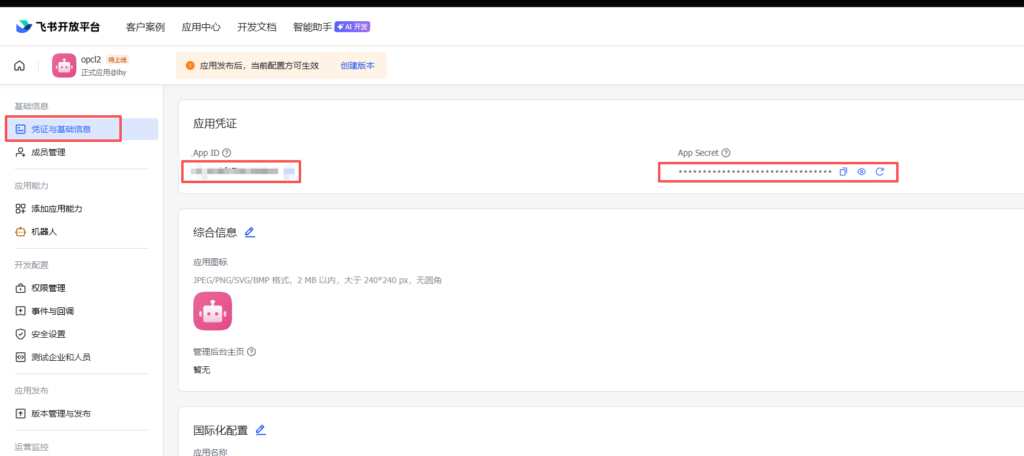 配置完成后,将app id,和app secret复制下来