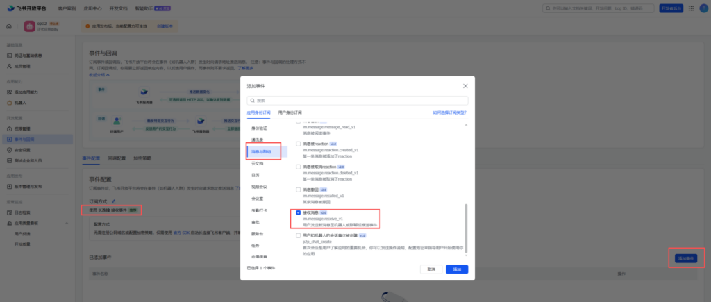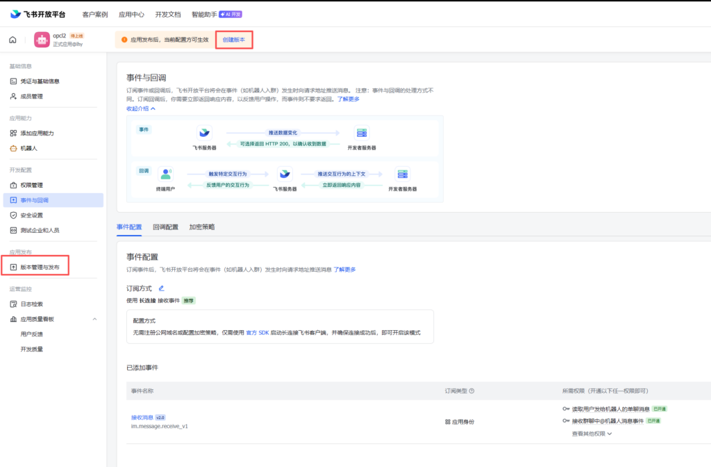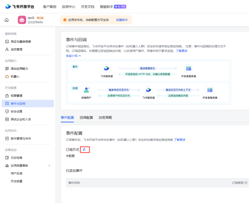 返回飞书页面,进入下图菜单,点击红框按钮,配置事件与回调