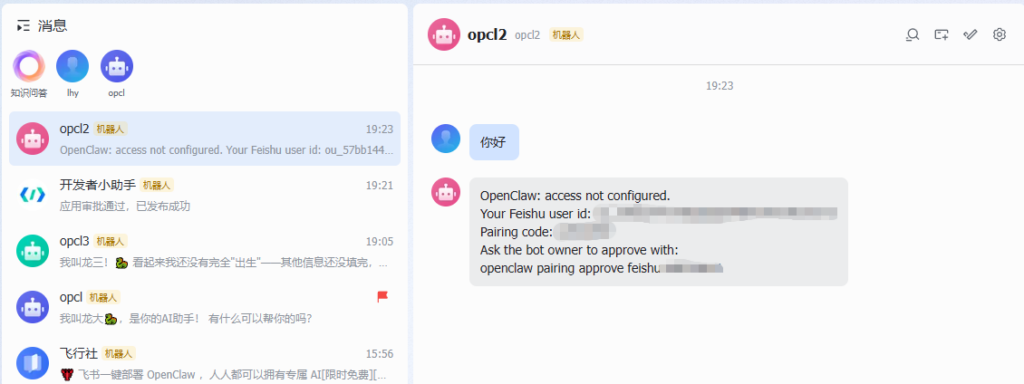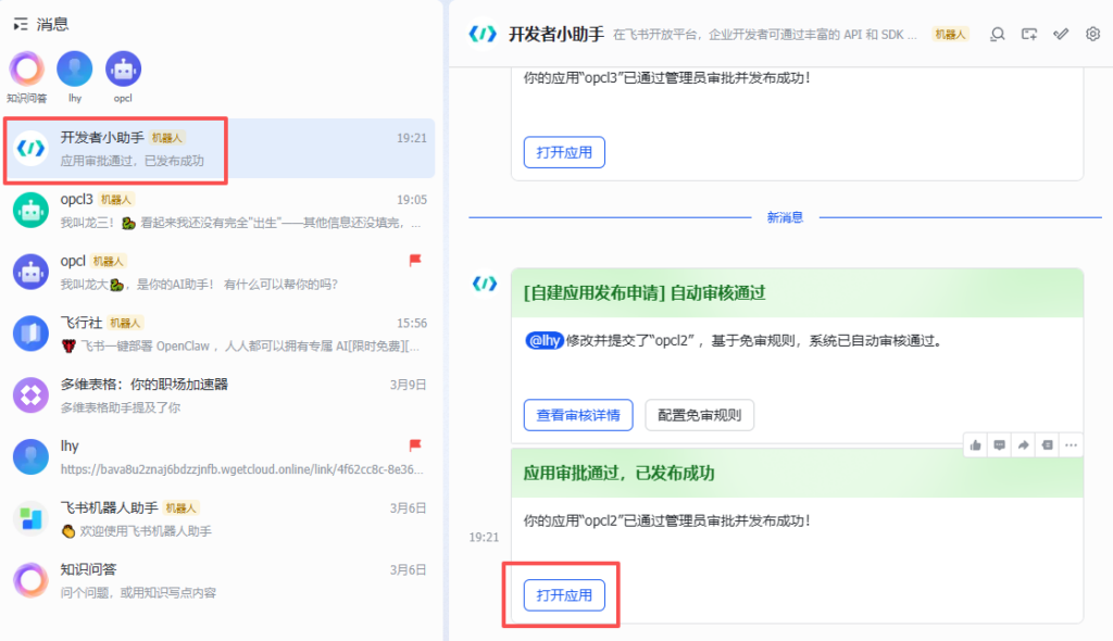 发布版本后,飞书消息列表“开发者小助手”提示应用审批通过,点击“打开应用”